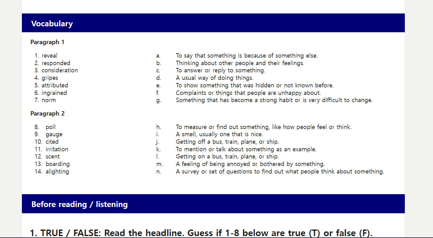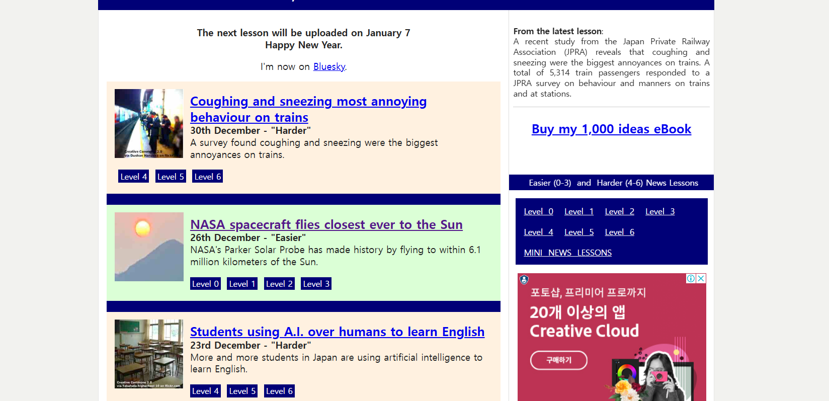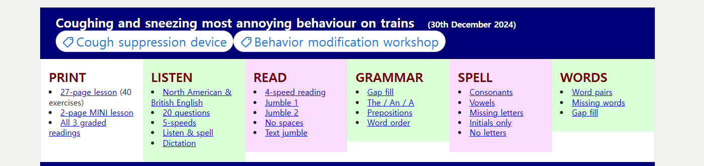 같은 내용을 초급부터 고급까지 다양한 레벨의 영어 실력자들을 위한 글이 제공된다. 레벨이 낮을수록 내용이 간략하고, 레벨이 높을수록 구체적이다. 해당 글에 대한 오디오 자료 뿐만 아니라 글에 대한 이해를 체크할 수 있는 문제도 제공한다.